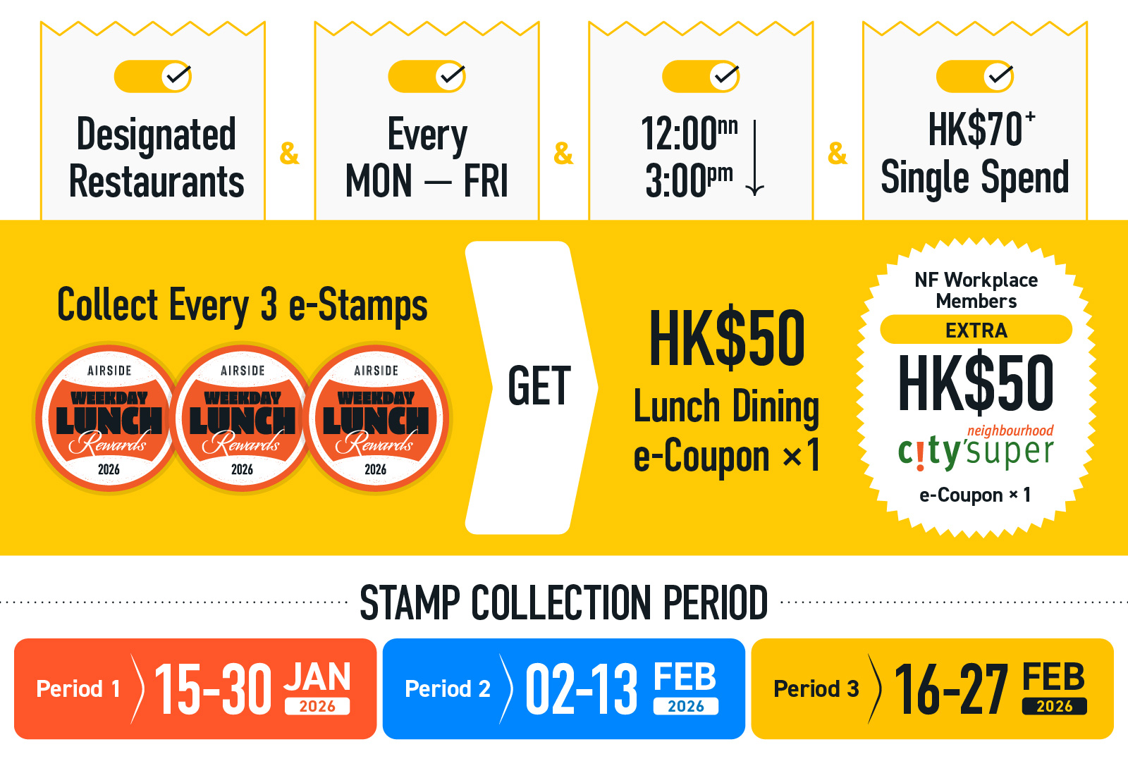 From 15 Jan 2026 till 27 Feb 2026, make a single HK$70+ lunch spending at AIRSIDE designated restaurants , upload your e-payment receipt to earn 1 e-stamp instantly, receive one "HK$50 AIRSIDE Lunch Dining e-Coupon" for every 3 stamps collected!
