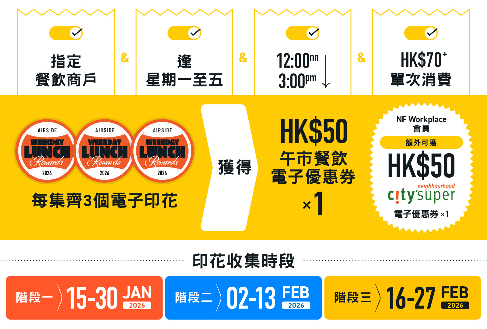 2026年1月15日至2月27日期间,于AIRSIDE指定餐厅单一午餐消费满HK$70,上载电子支付收据即赚1个电子印花,每集3个印花即送「HK$50 AIRSIDE午市餐饮电子优惠券」!已启用NF Workplace会员再赏「HK$50 city’super电子优惠券」,越食越着数!