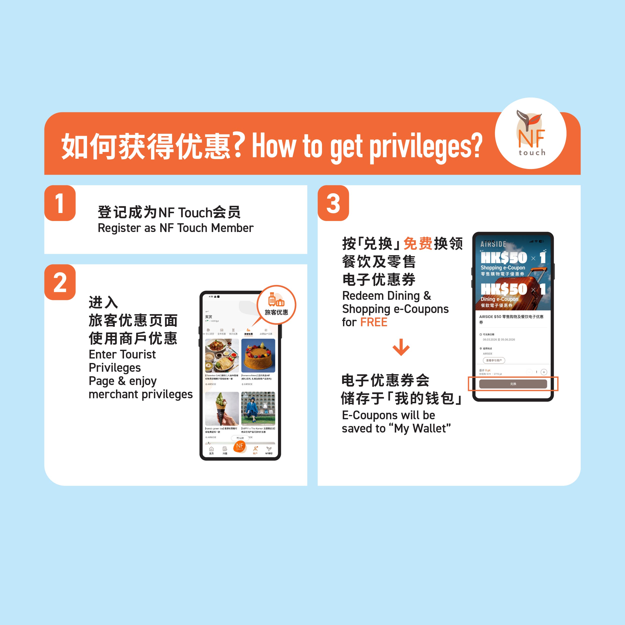 旅客只需以海外手机电话号码成功登记成为NF Touch会员,即可免费换领多重专享礼遇!