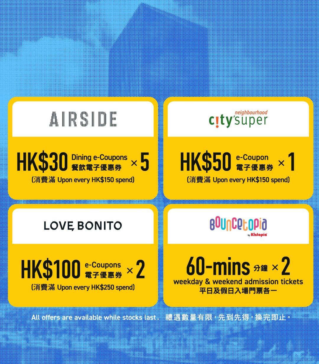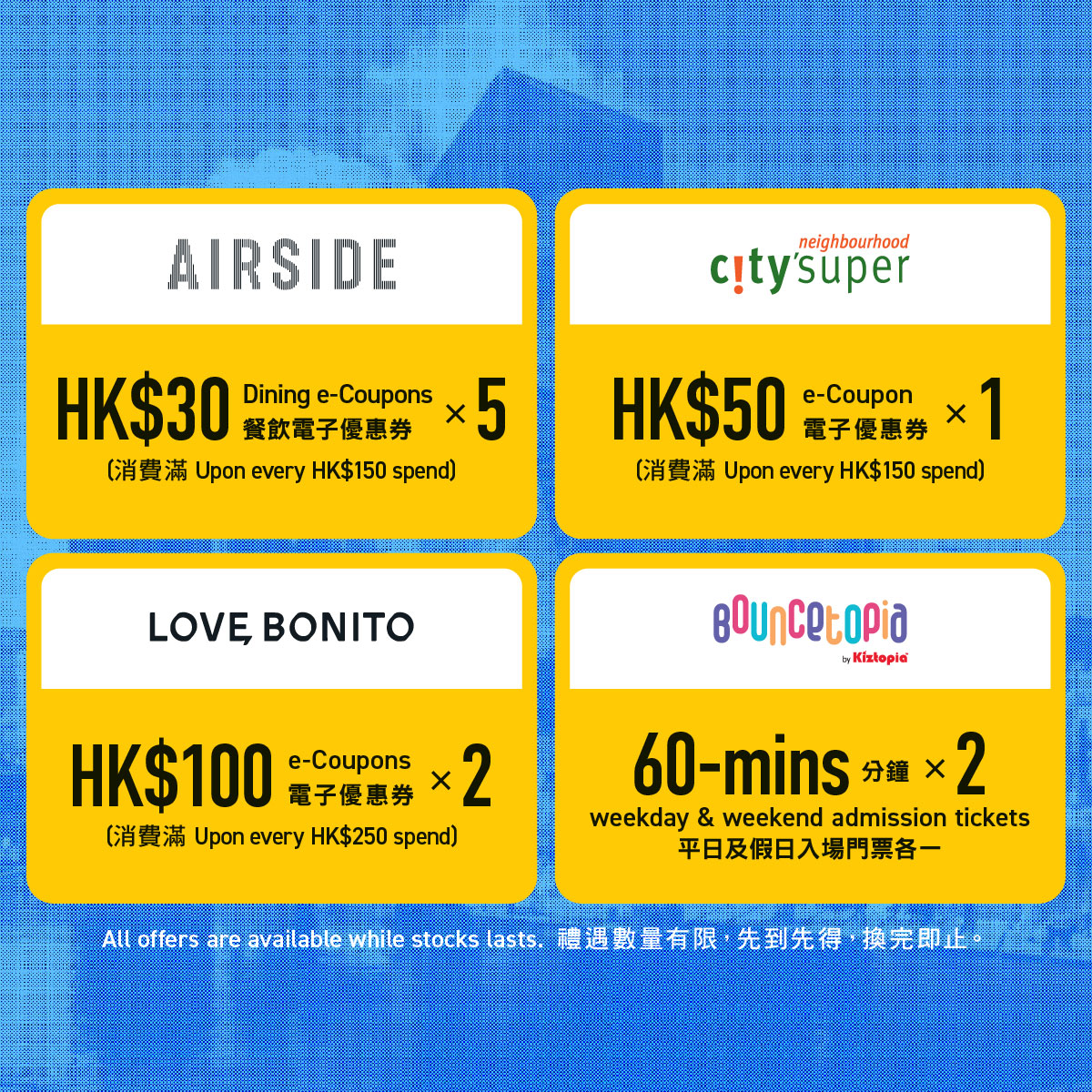 - HK$30 AIRSIDE 餐飲電子優惠券5張 (消費滿HK$150可使用)