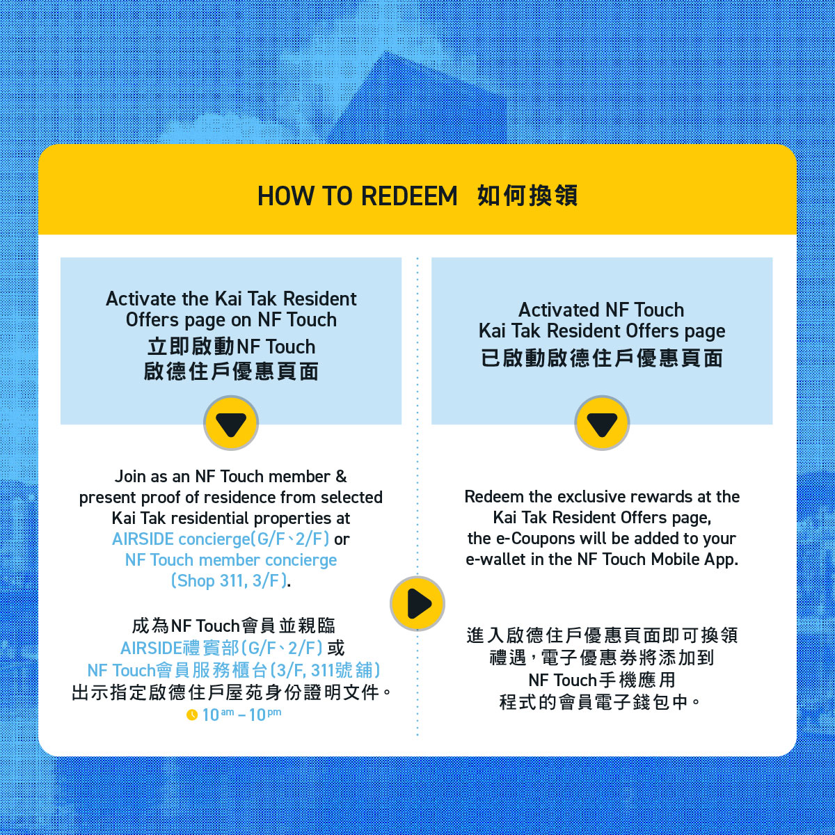 特選啟德住戶只需登記成為NF Touch會員並啟動啟德住戶優惠頁面,即可換領高達HK$700獨家禮遇!
