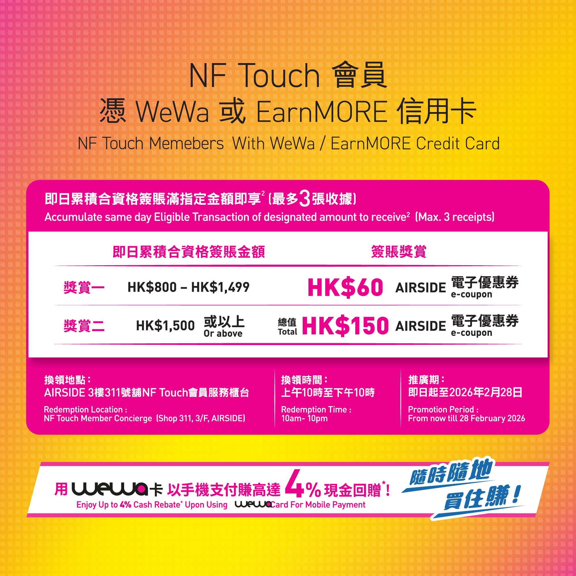 登記成為NF Touch會員並以WeWa/EarnMORE 信用卡消費滿指定金額,即可換領以下精彩禮遇及獨家商戶優惠。